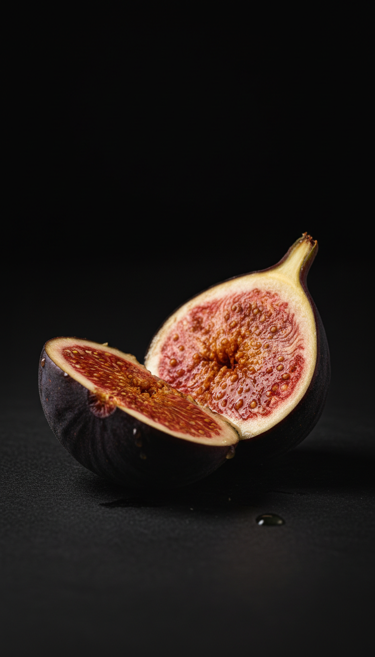 Higo fresco, néctar rojo, frutos morados jugosos.